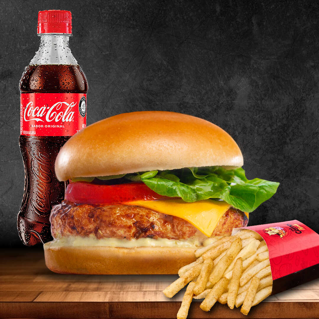 Hamburguesa de pollo parrilla de 125 gr aprox, tomate, lechuga, queso cheddar, con papas y coca cola 400ml