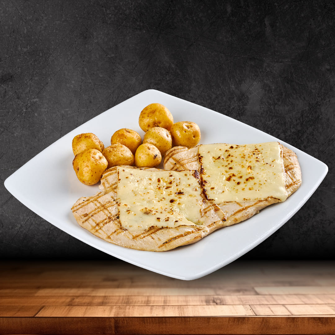 Pechuga Gratinada acompañada de Papa criolla y ensalada de temporada.