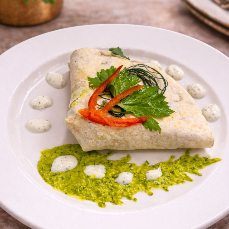 Wrap con verduras y carne de res adobada con cebolla morada, ajo, perejil y estragón.