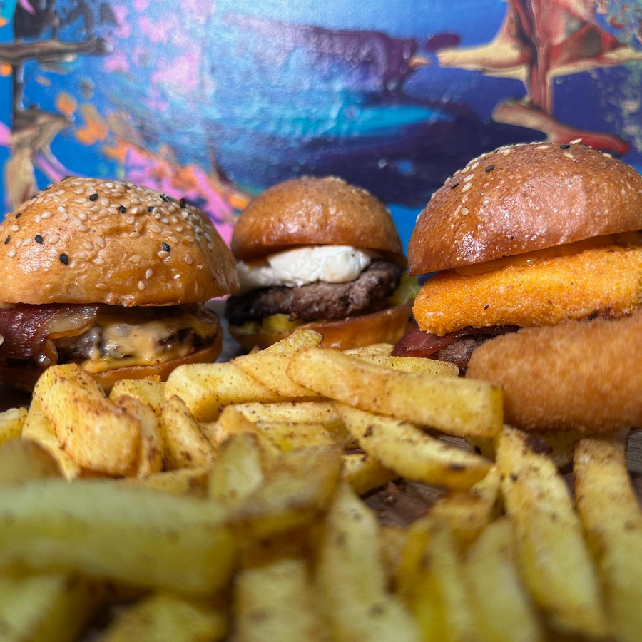 Tres de nuestras hamburguesas en versión MINI (Classic, Golden Velvet y Phili), acompañadas con porción de papas 🍟, palitos de queso, dos gaseosas mini y nuestra inigualable salsa de la casa.