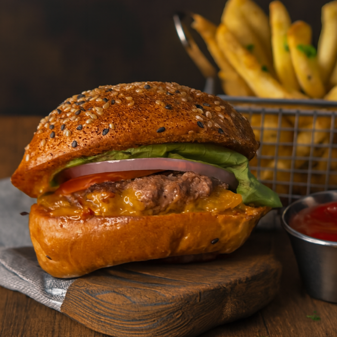 Hamburguesa 180 g certified angus beef, queso mozzarella o americano, tocineta premium, lechuga, tomate, cebolla, salsa de la casa, acompañada con papas a la francesa