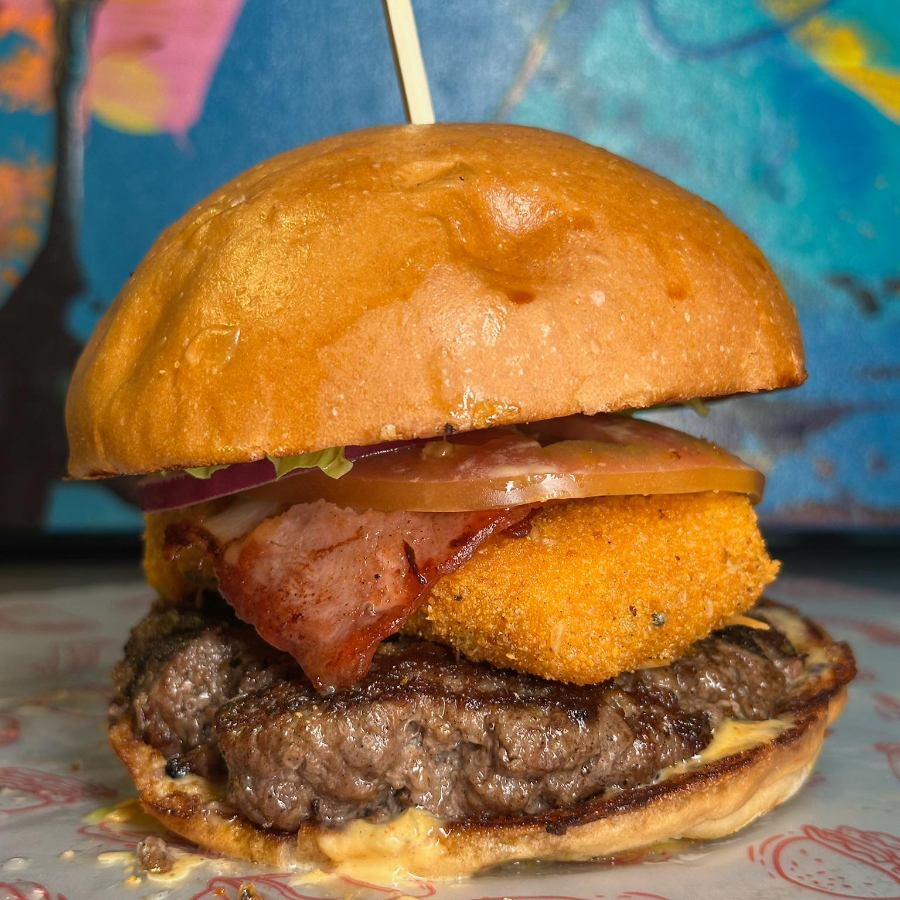 Hamburguesa 180 g certified angus beef, queso philadelphia, queso azul, queso mozzarella, mermelada de tocineta, lechuga, tomate, cebolla, salsa de la casa, acompañada con papas a la francesa