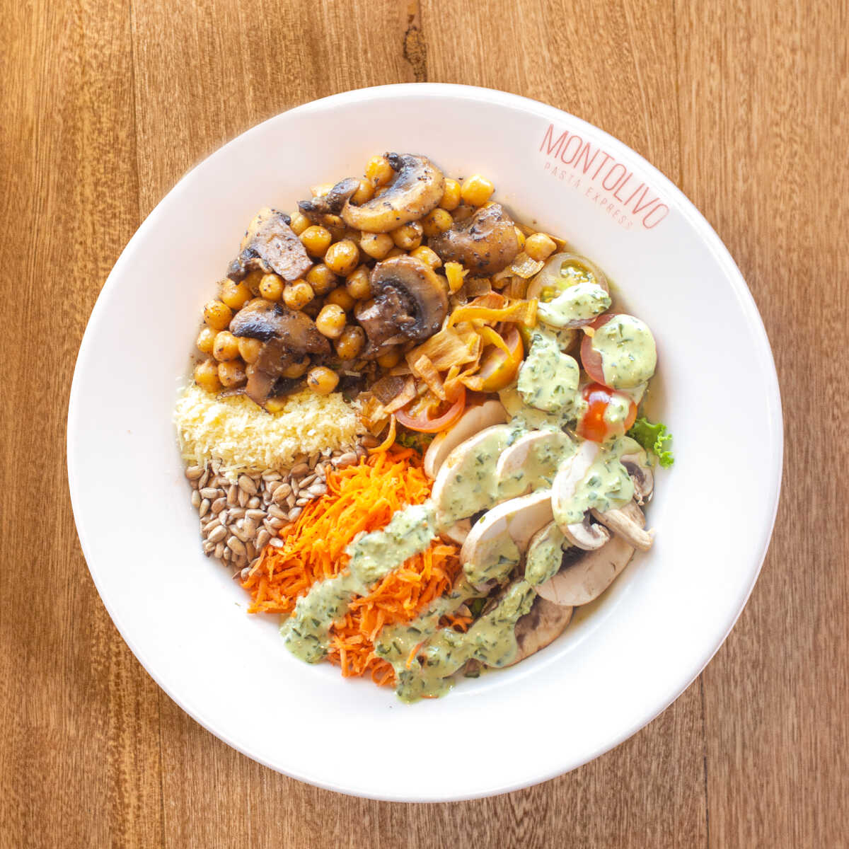 A tu gusto en 4 simples pasos (base, proteína, vinagreta y complementos).