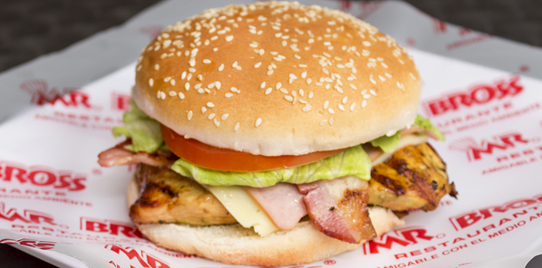 Hamburguesa con 2 filetes de pollo, lechuga, tomate, cebolla, queso doble crema y salsas.