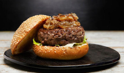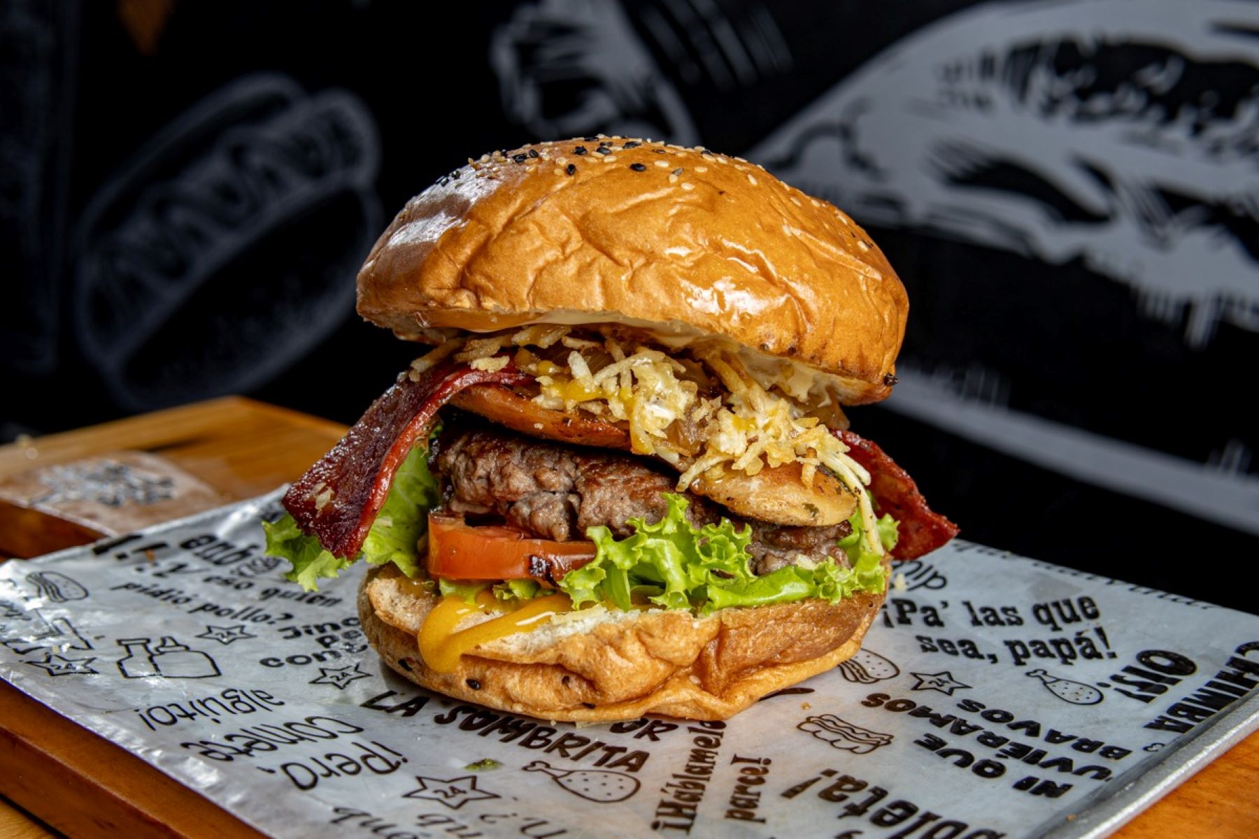 Pan de hamburguesa, doble carne de res, tocineta, lechuga, tomate, cebolla caramelizada, queso mozzarella y salsas.