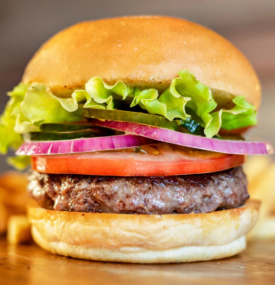Pan de hamburguesa, carne de res, tocineta, queso, lechuga, tomate, cebolla caramelizada y salsas.