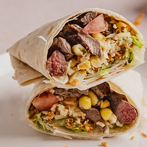 tortilla grande,carne,lechuga,maiz,pasta de tomate salsa cheddar,mostaza,cebolla