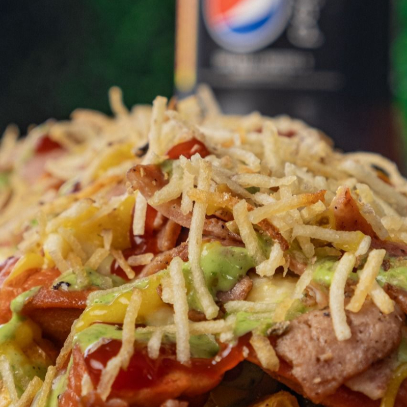 doritos, pollo desmechado,maiz,lechuga,ripio salsa cheddar,bbq,salsa de la casa