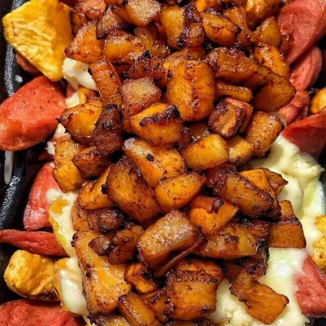 papa, salchichas,maiz,tocineta, queso chorizo,carne, pollo,maduritos, ripio y salsas