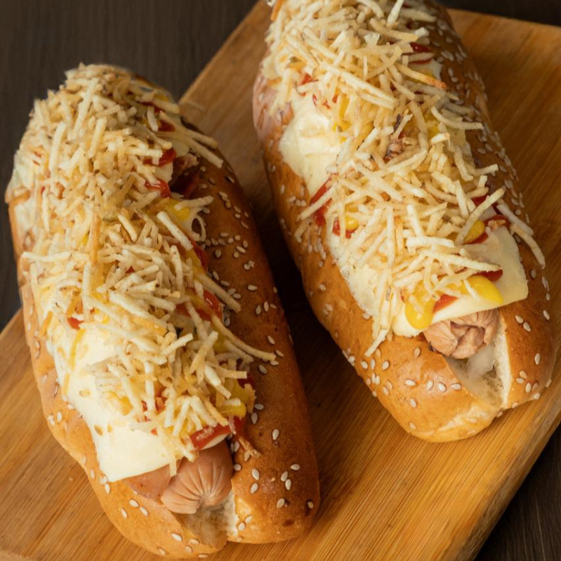 pan perro brioche, salchicha americana cebolla,madurito,tocineta,queso,ripio carne desmechada