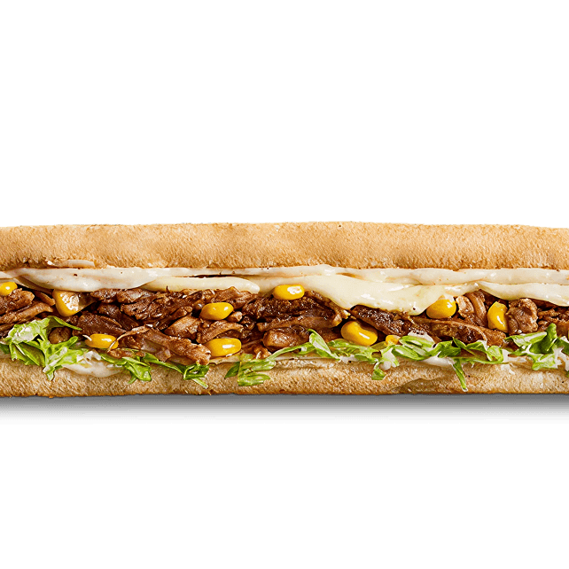 pan de 21 cm , carne de costilla desmechada,tocineta,maiz,queso,lechuga,tomate,salsa de ajo mostaza y bbq