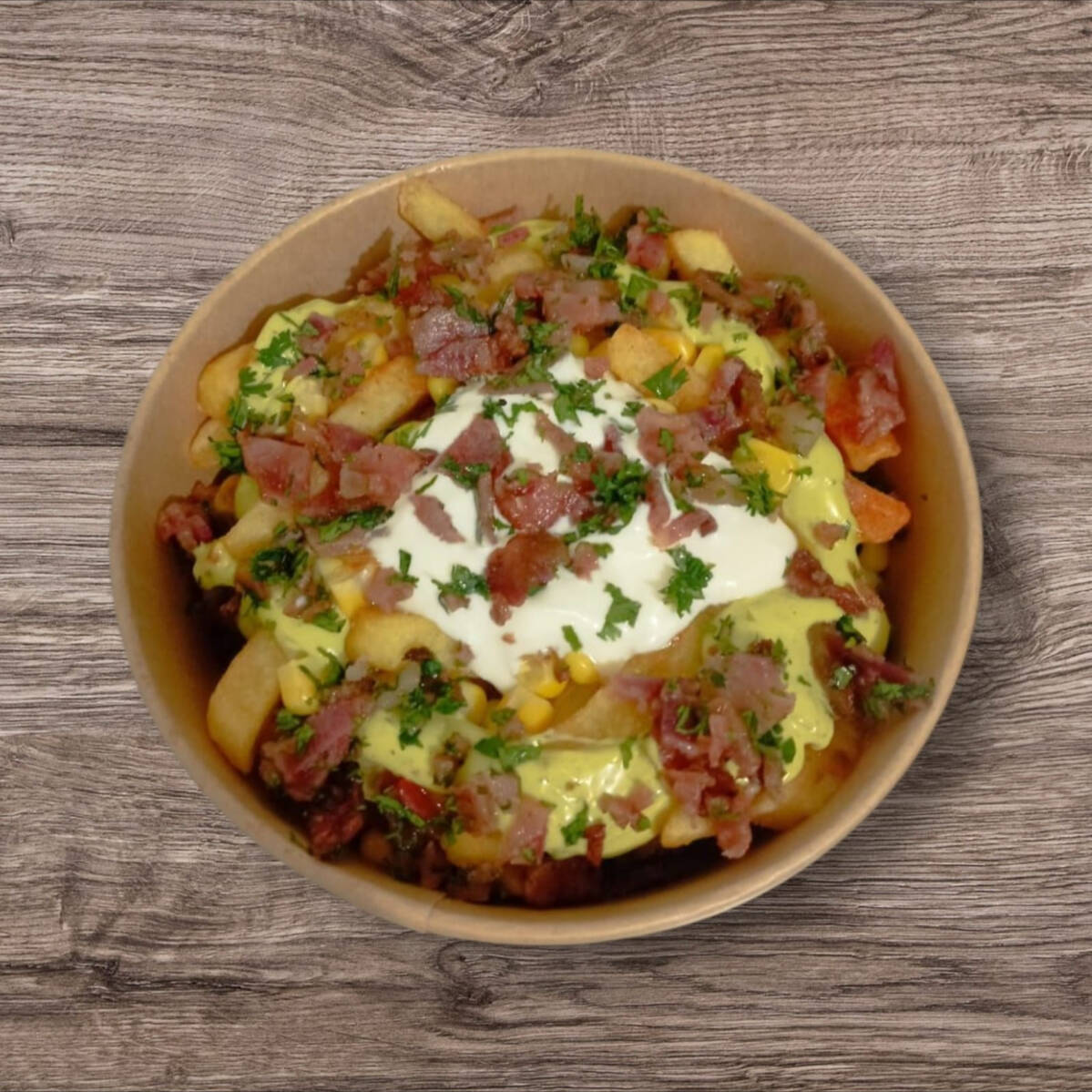 papa , salchichas,maiz,tocineta, queso chorizo,ripio y salsas