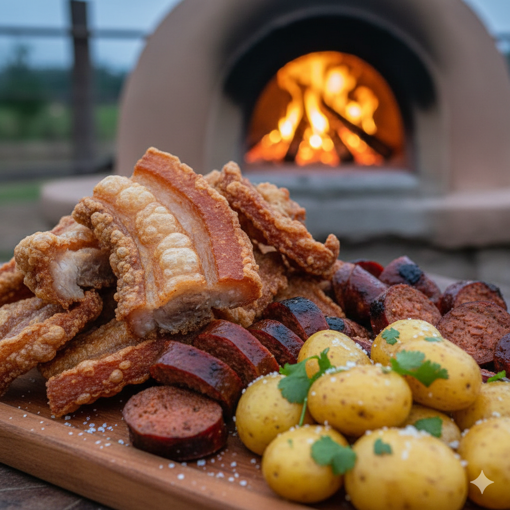 Acompañado de salchicha ranchera, papa amarilla, queso, tocineta, ripio de papa, chicharrón al barril, costilla y chorizo.