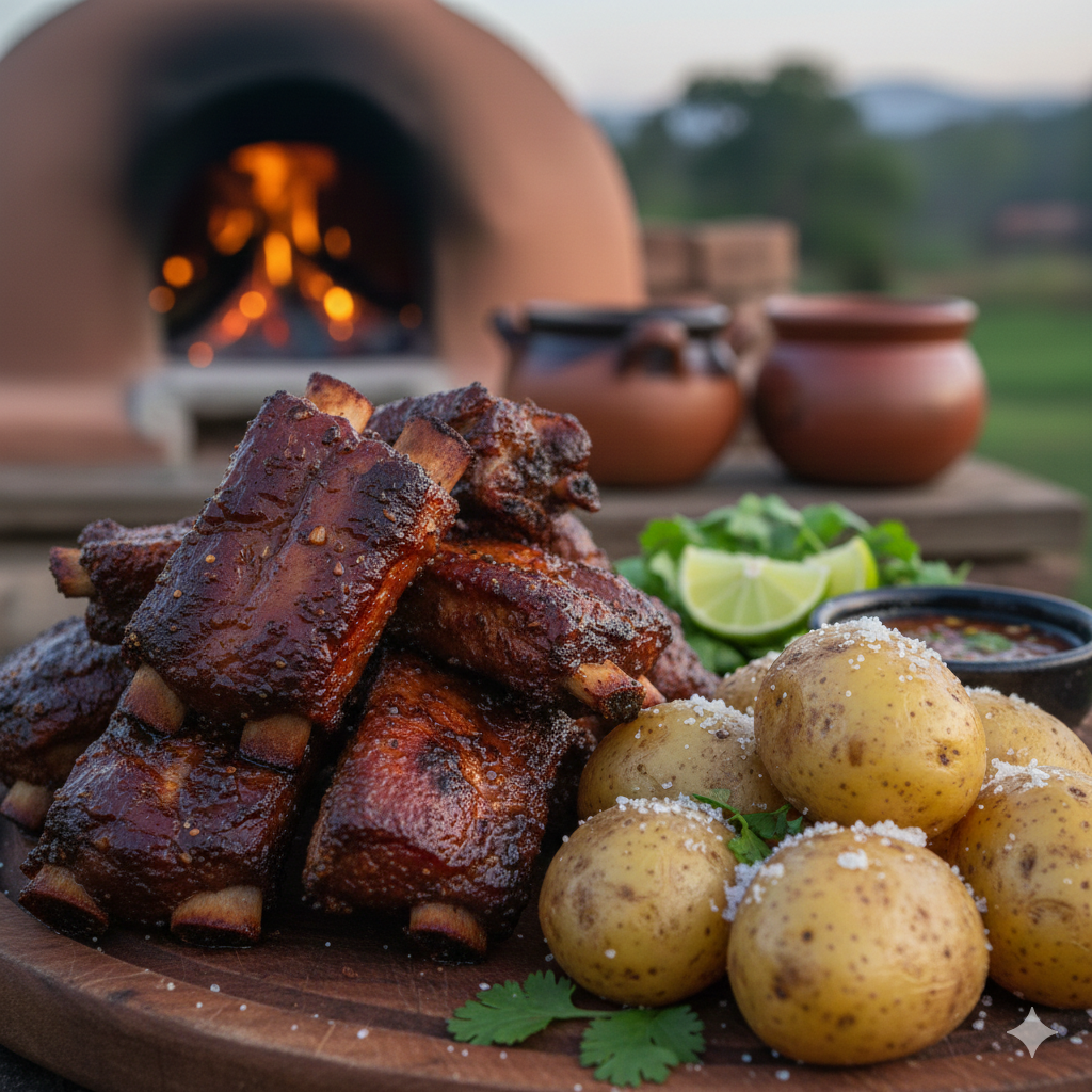Acompañada de costilla, chorizo santarosano y papa salada.