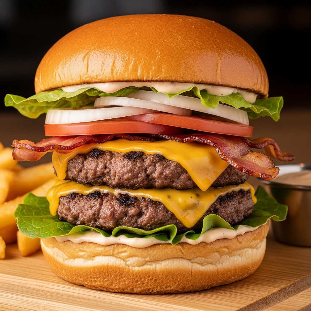 Acompañada de pan, doble carne al barril, queso tipo americano, doble tocineta, tomate, lechuga, cebolla y salsa de la casa.