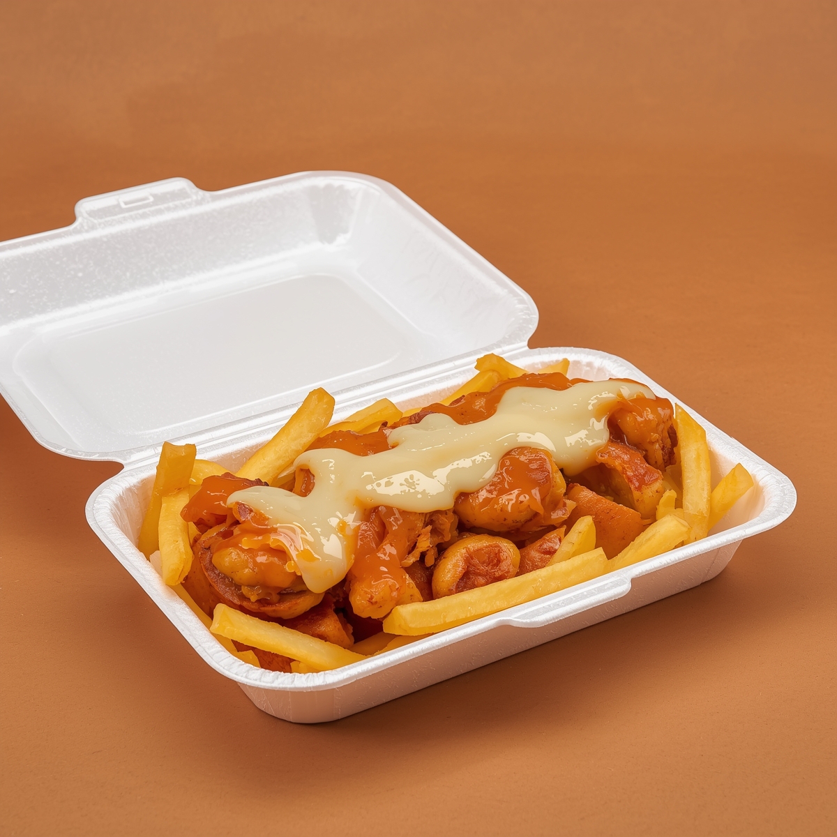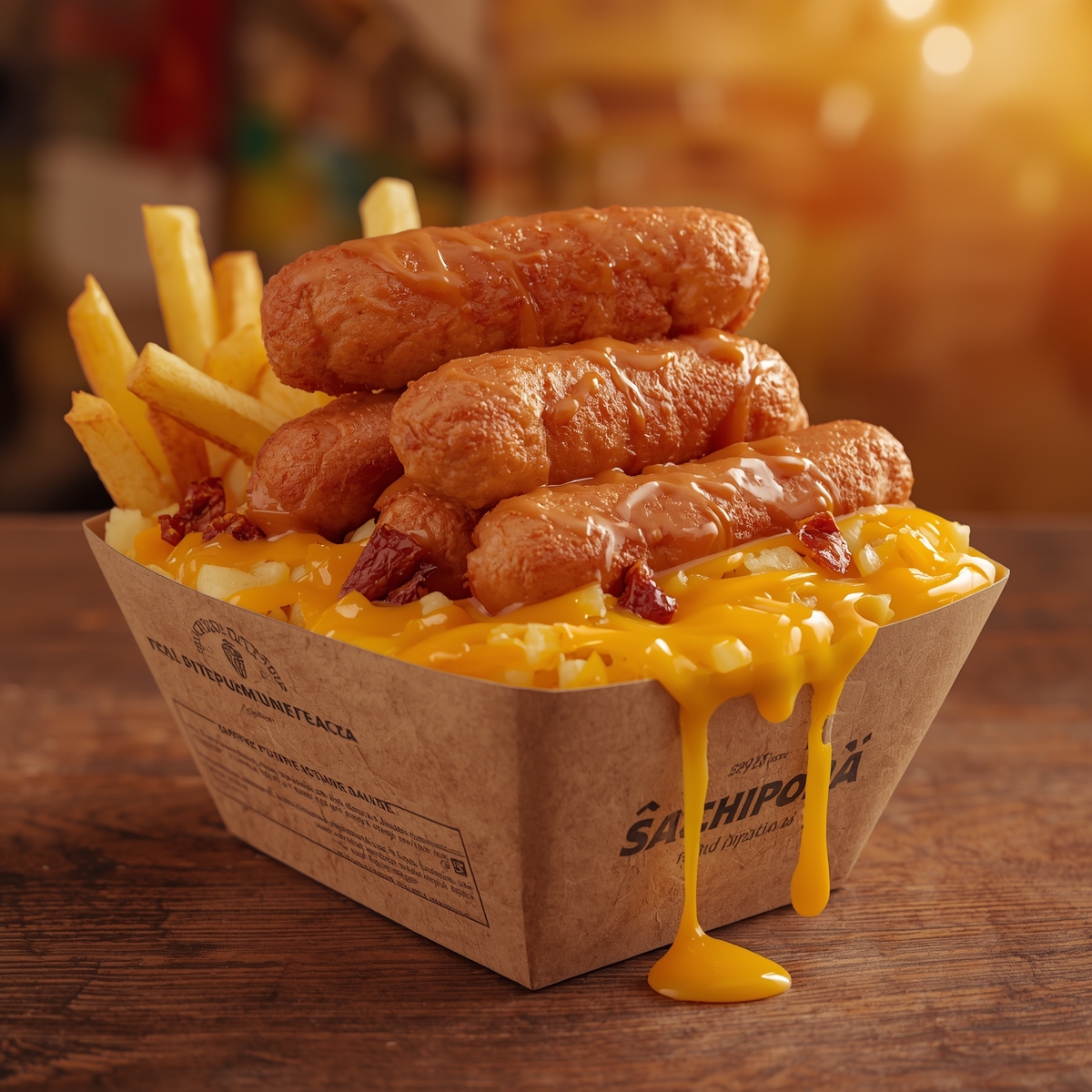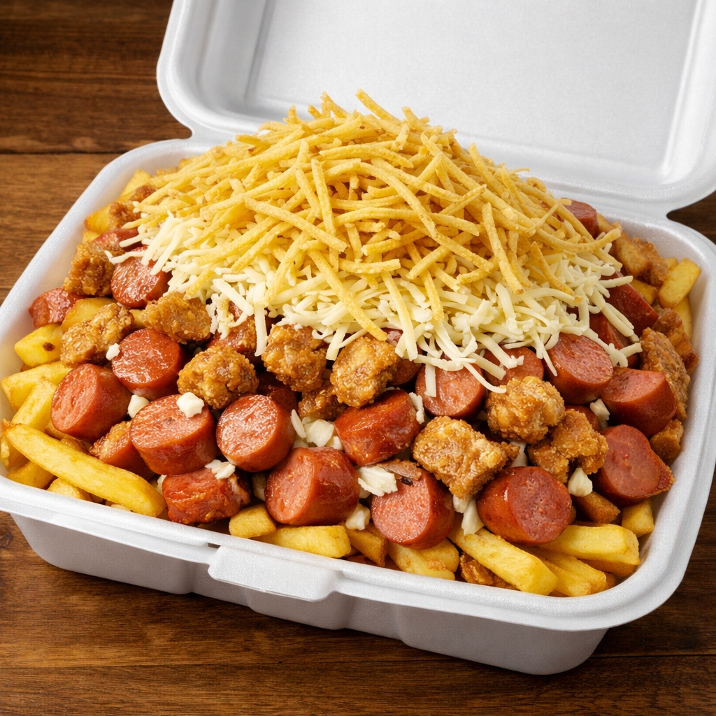 Acompañado de salchicha ranchera, papa amarilla, queso, tocineta, ripio de papa y salsa de la casa.