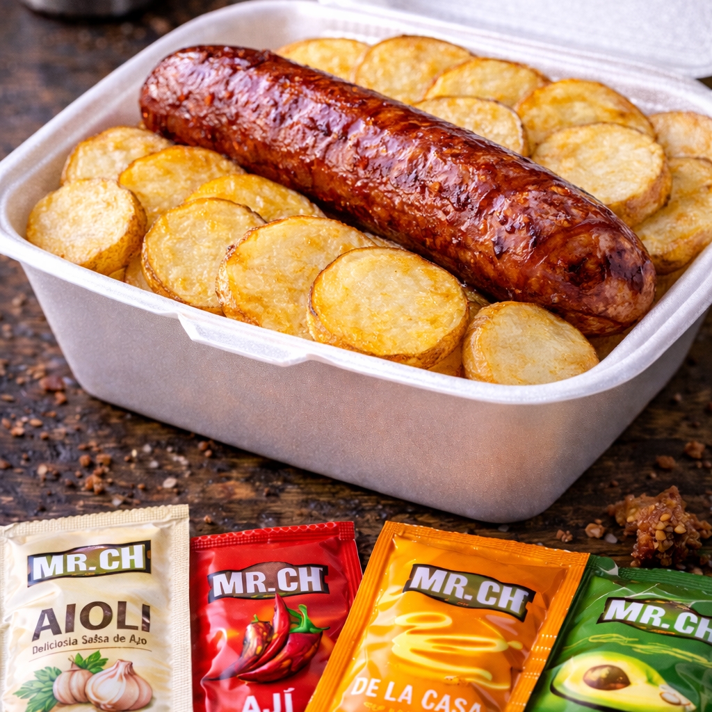 Acompañado de salchicha ranchera, papa amarilla, queso y salsa de la casa.