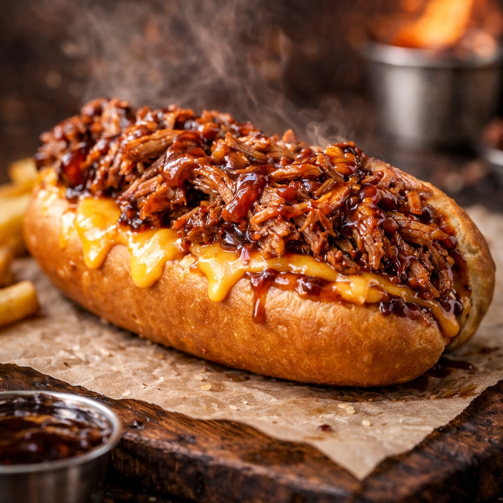 Acompañada de pan, carne al barril, queso americano, tomate, lechuga, cebolla y salsa de la casa.