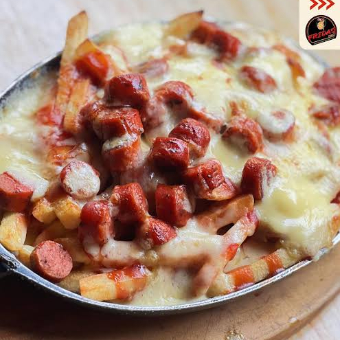 Salchicha en rodajas, con papas amarillas fritas, ripio crujiente y abundante queso gratinado por encima, acompañadas de salsa al gusto.