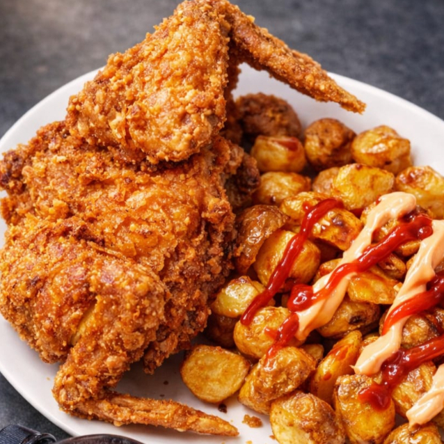 Ala completa de pollo apanada (par de alas unidas por la costilla), jugosa por dentro y crujiente por fuera, Acompañada de una porción generosa de papa amarilla.