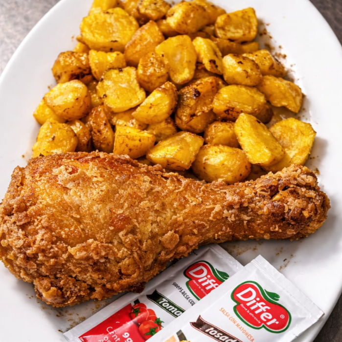 Muslo de pollo grande y sustancioso, apanado y frito al punto ideal, Acompañado de una porción generosa de papa amarilla