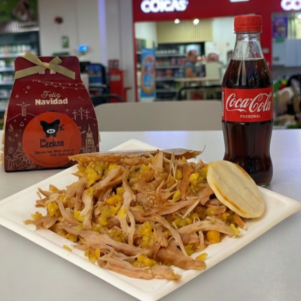 Tu antojo navideño completo en un solo combo : disfruta una porción personal de 280 gramos de lechona jugosa y bien servida, acompañada de arepa, coca-cola personal, y para cerrar como se debe, una cajita con 14 galletitas con chips de chocolate