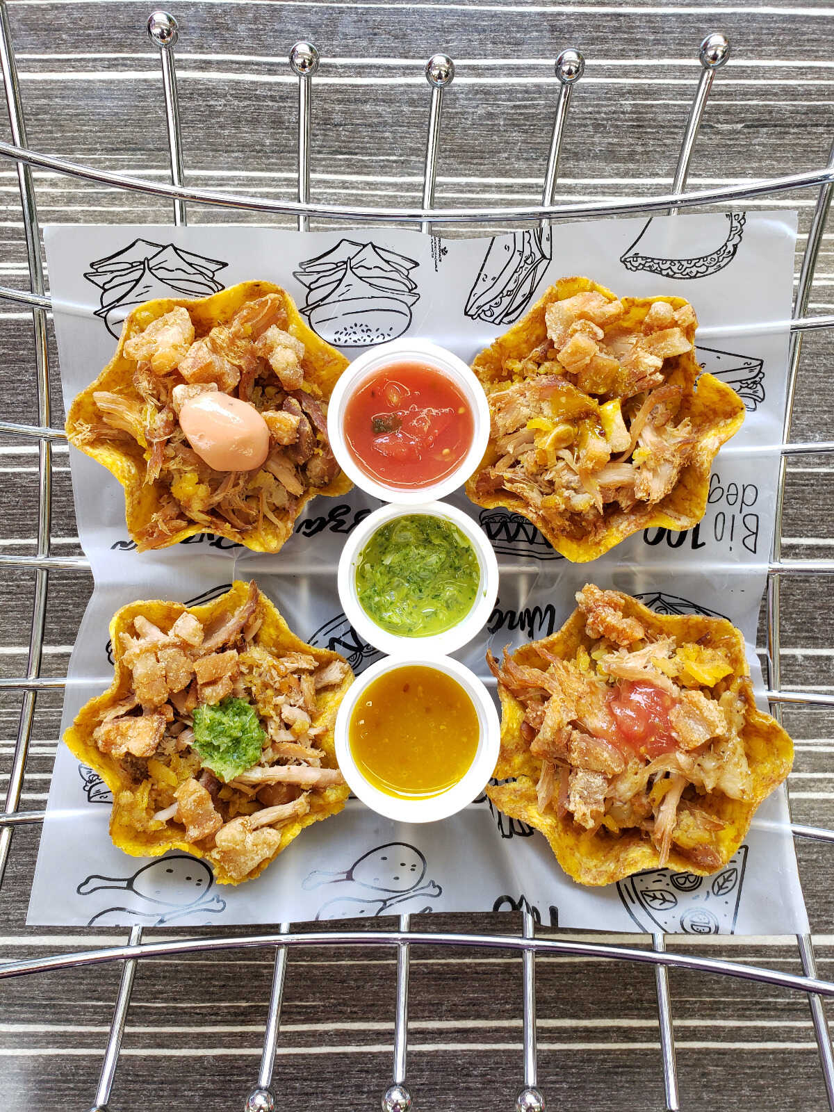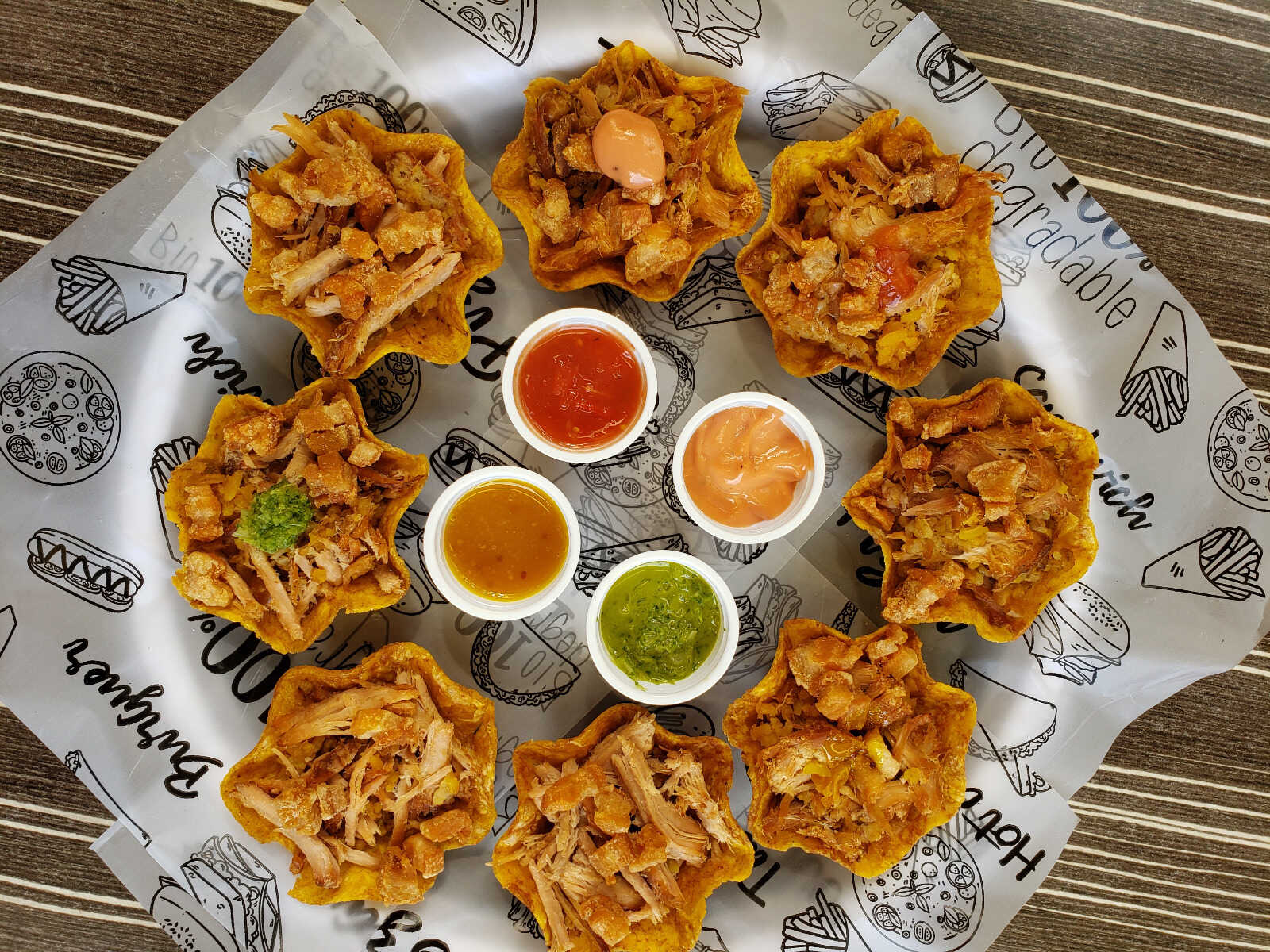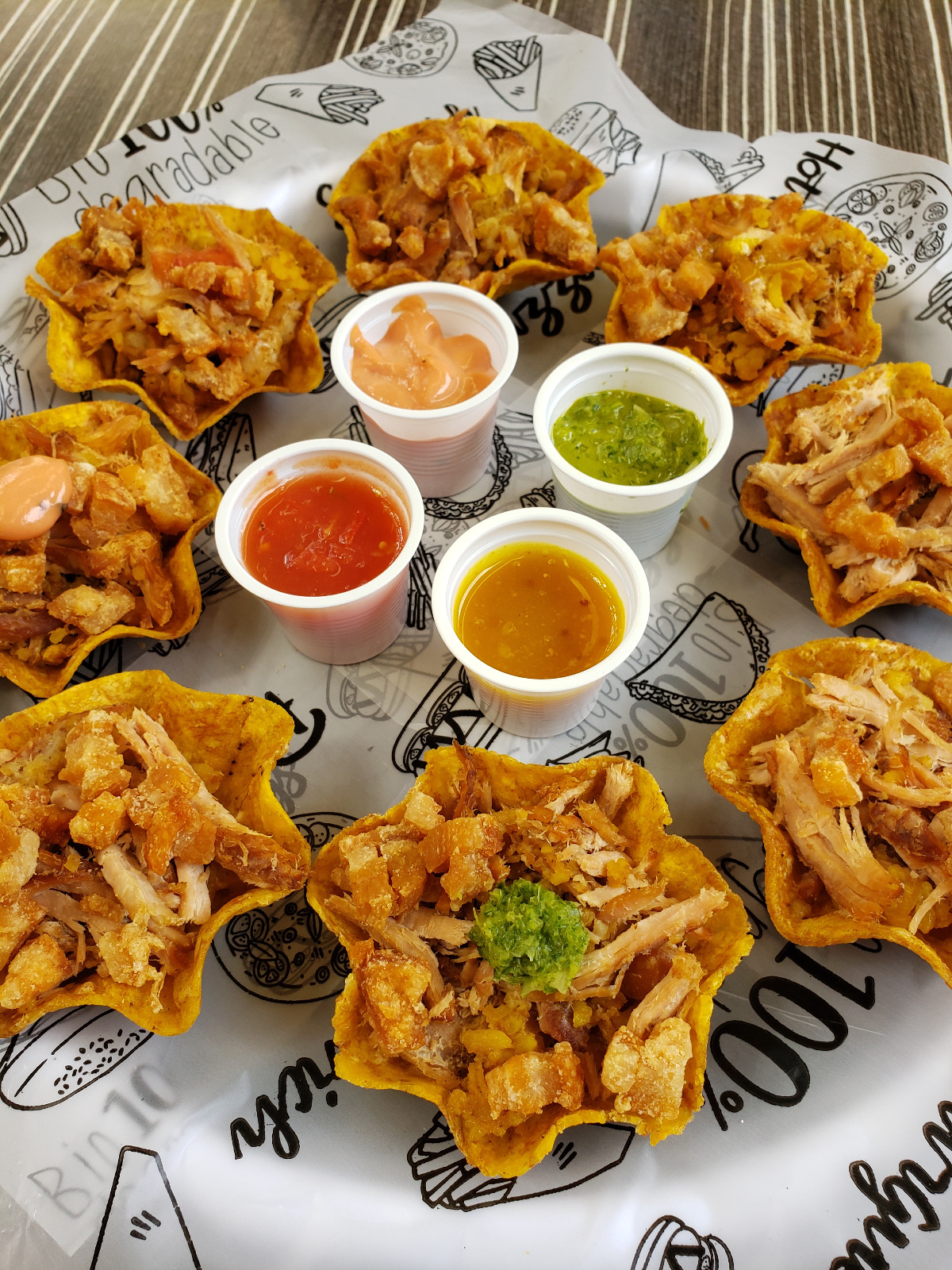 Canasta de plátano con 30 g de lechona y chicharrón.