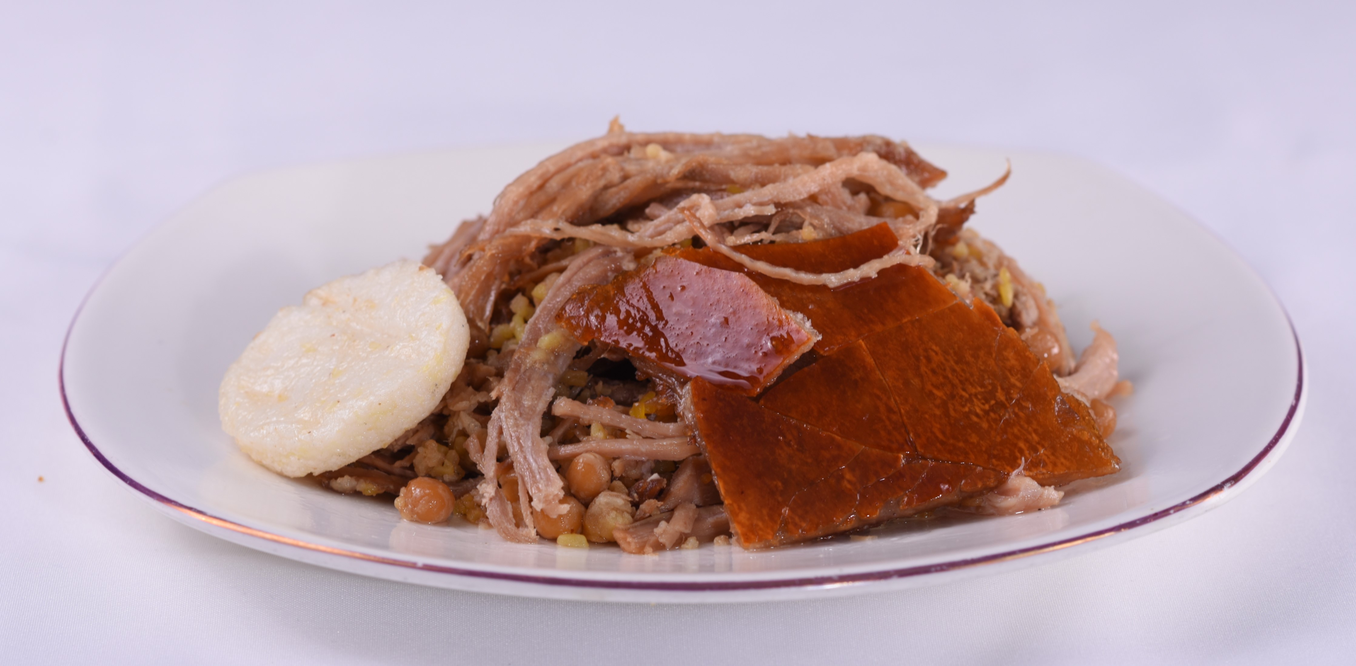 Lechona por 2 unidades de 300 g con arepa, 2 bebidas a elección.