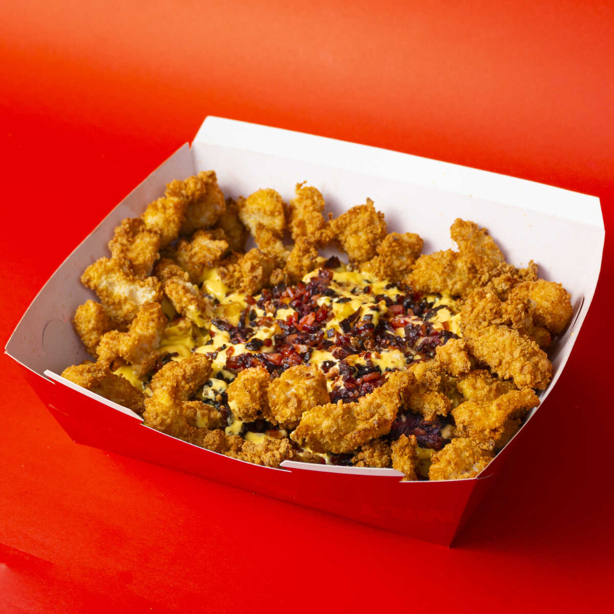 Deliciosas papas a la francesa, bañadas en salsa de queso cheddar y crujiente tocineta, 200 g de pops que son trocitos de pollo.
