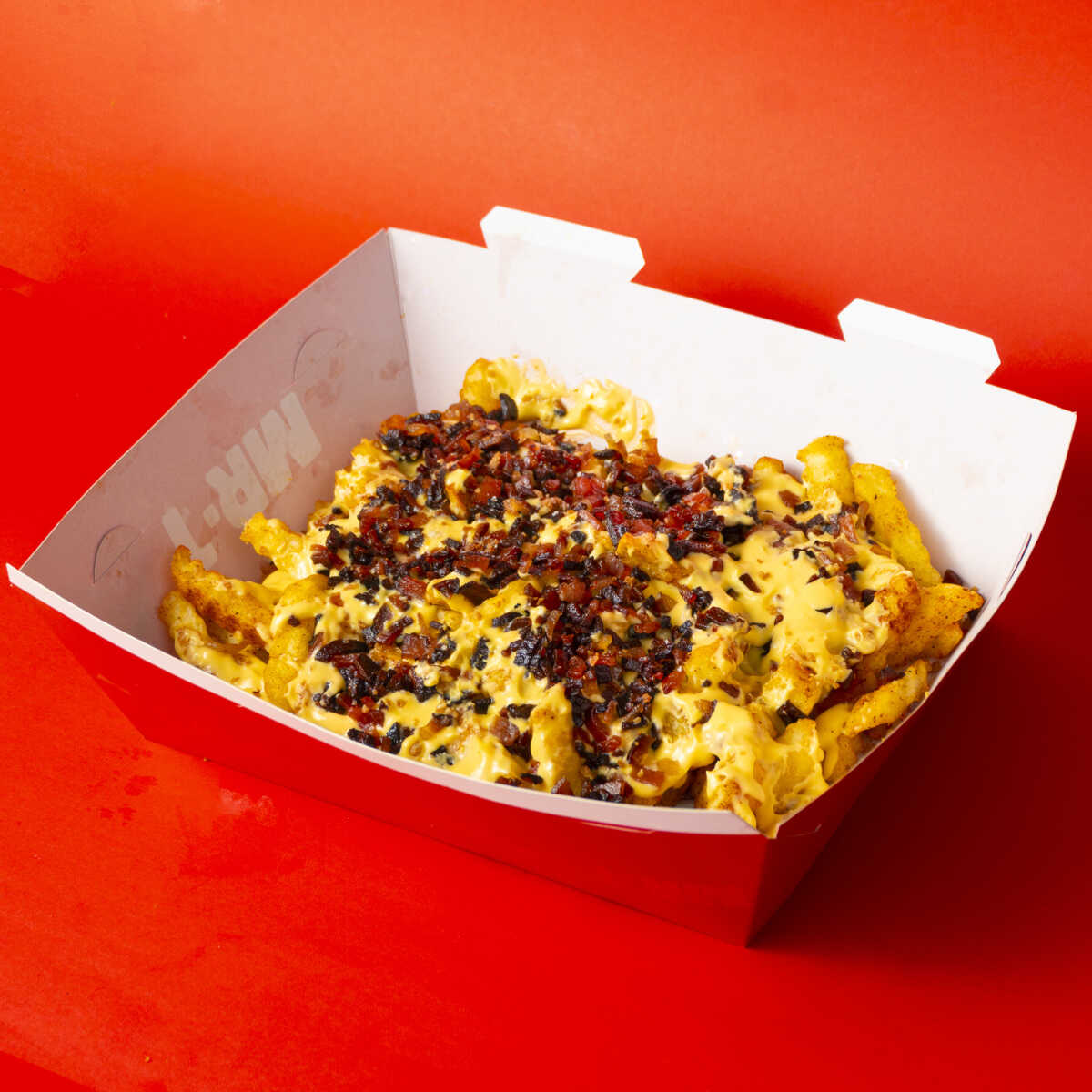 Deliciosas papas a la francesa, bañadas en salsa de queso cheddar y crujiente tocineta.