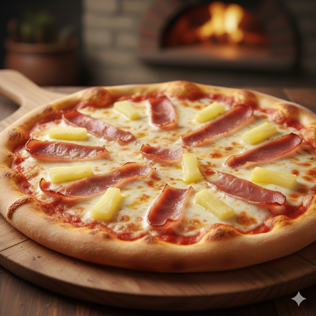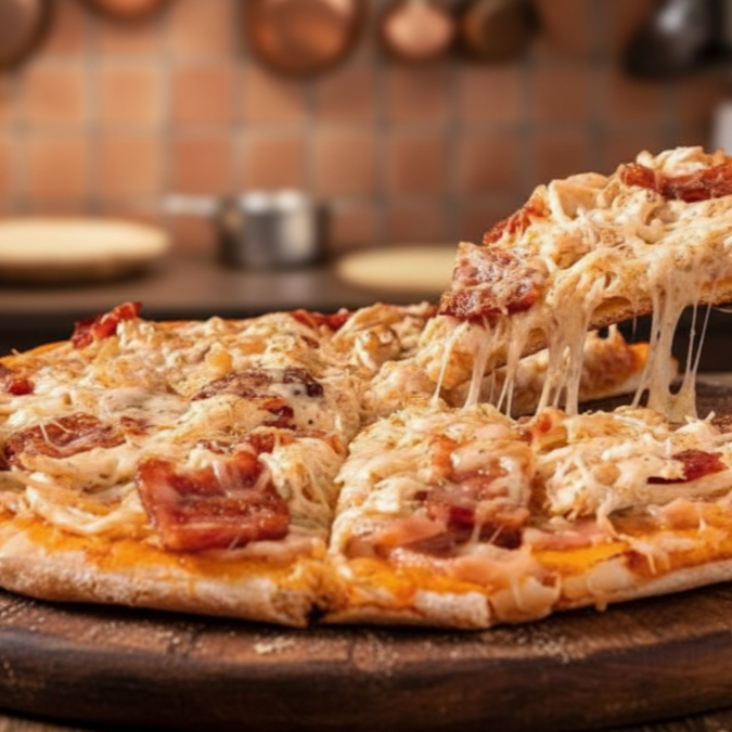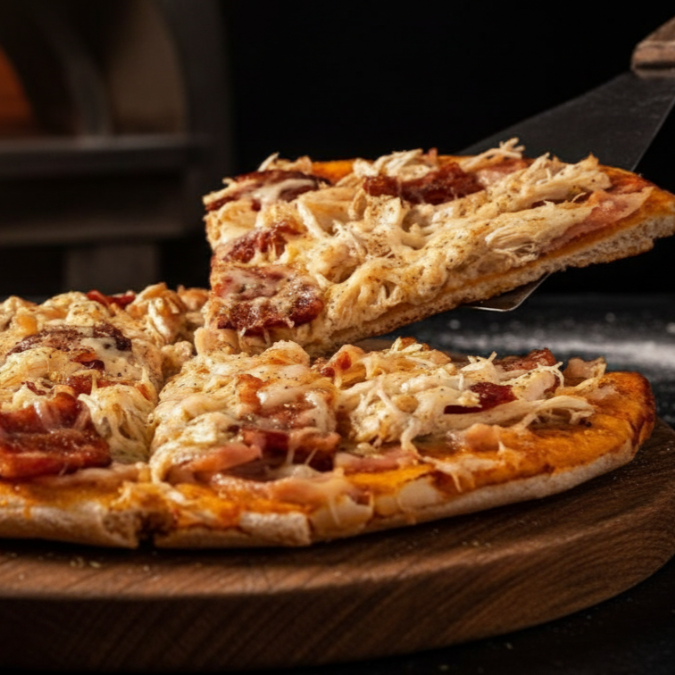 Tocineta, jamón, pollo desmechado, queso, orégano.