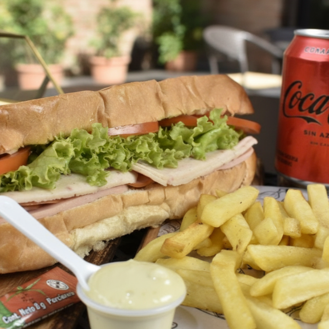 Delicioso sandwich con Salami, jamon, cordero, tomate, lechuga y salsa de la casa acompañado de porcion de papas a la francesa y gaseosa a eleccion