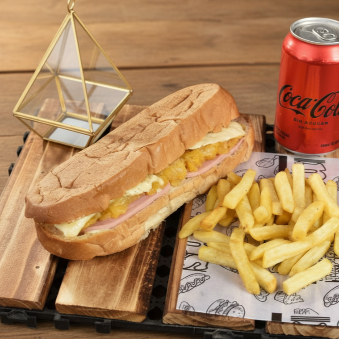 Delicioso sandwich con Jamon, piña, queso y salsa de la casa acompañado de porcion de papas a la francesa y gaseosa a eleccion