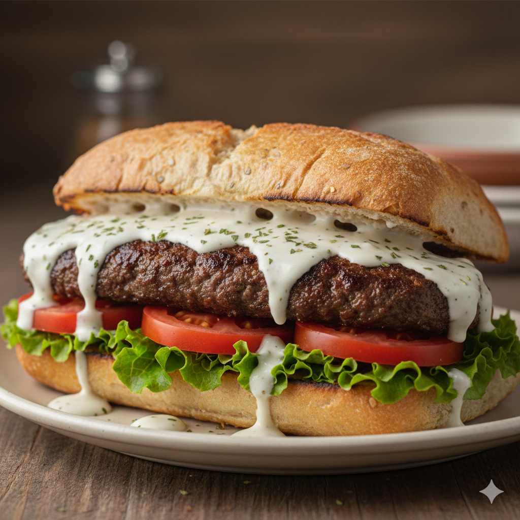 Sándwich con cordero, queso, tomate, lechuga y salsa de ajo.
