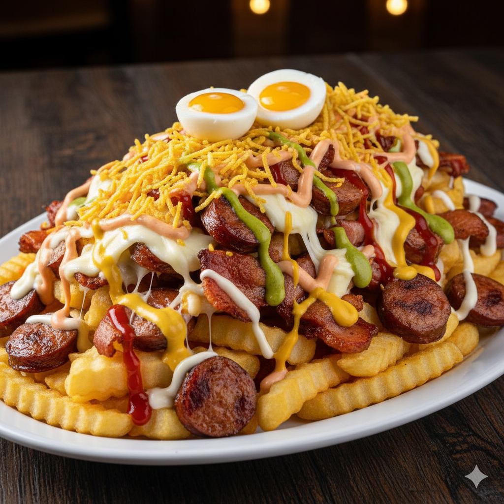 Papa francesa, tocineta, salchicha, doble queso, ripio, huevo codorniz, salsas.