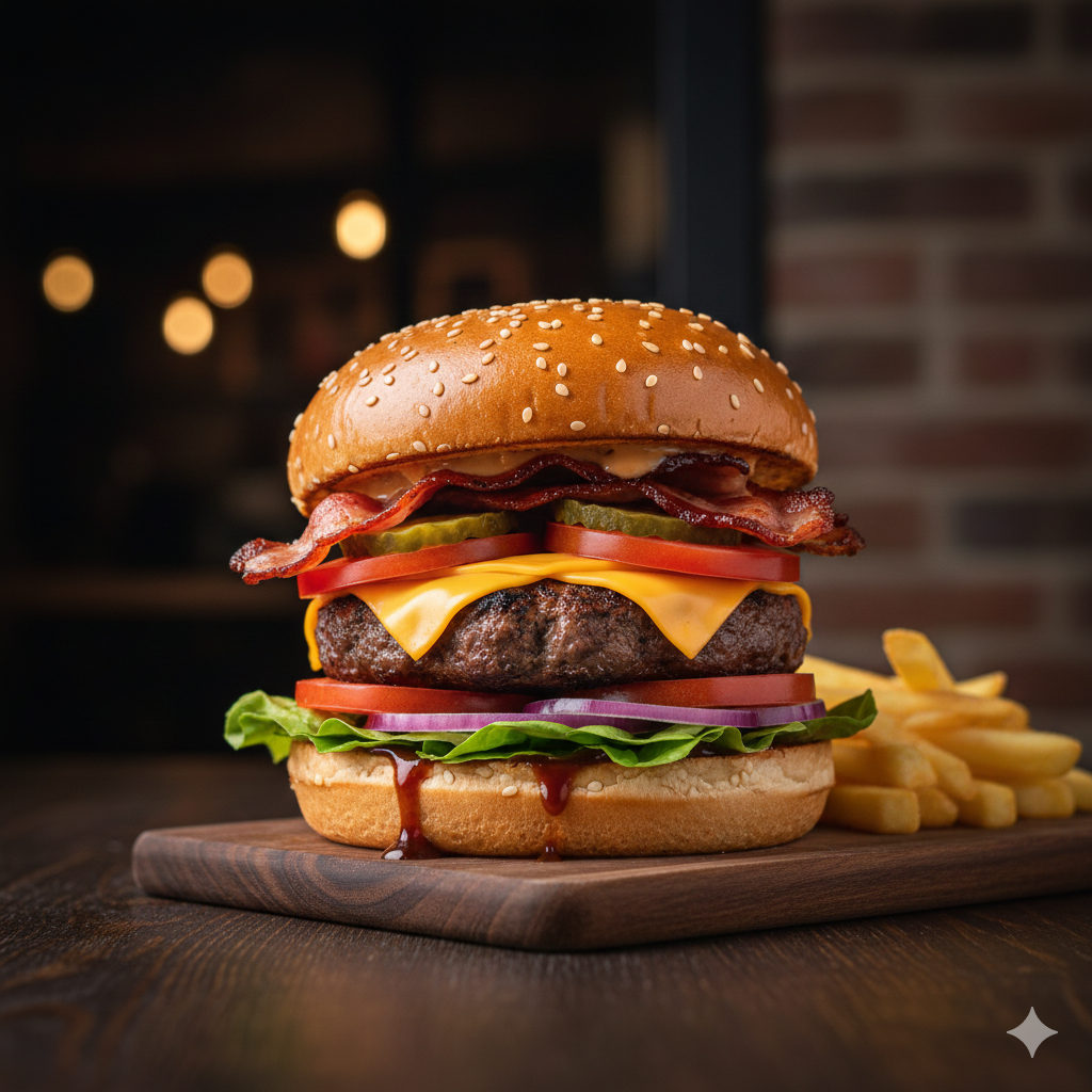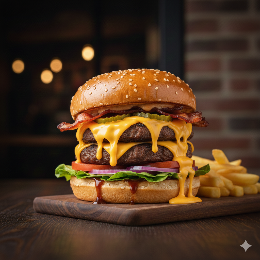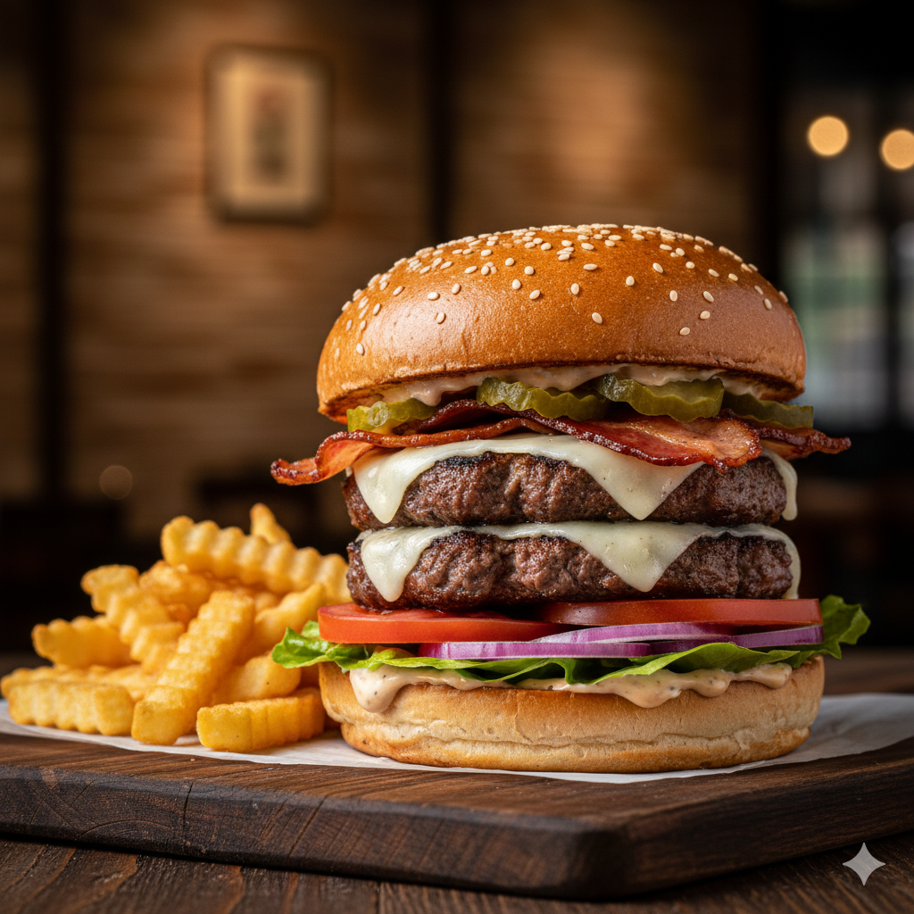 Doble carne angus, tocineta, queso americano, pepinillos, tomate, cebolla.