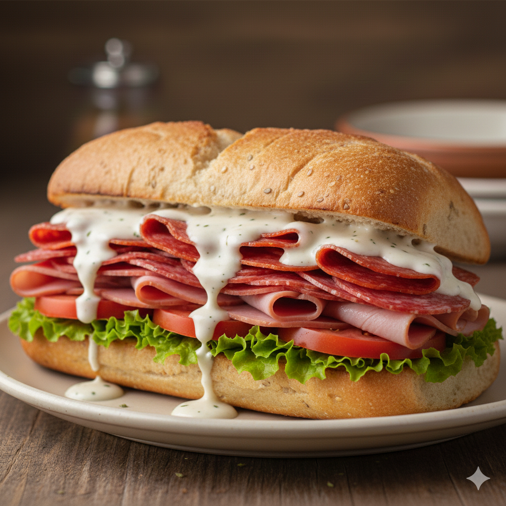 Delicioso sandwich con Peperoni, Salami Jamon, tomate, lechuga y salsa de la casa