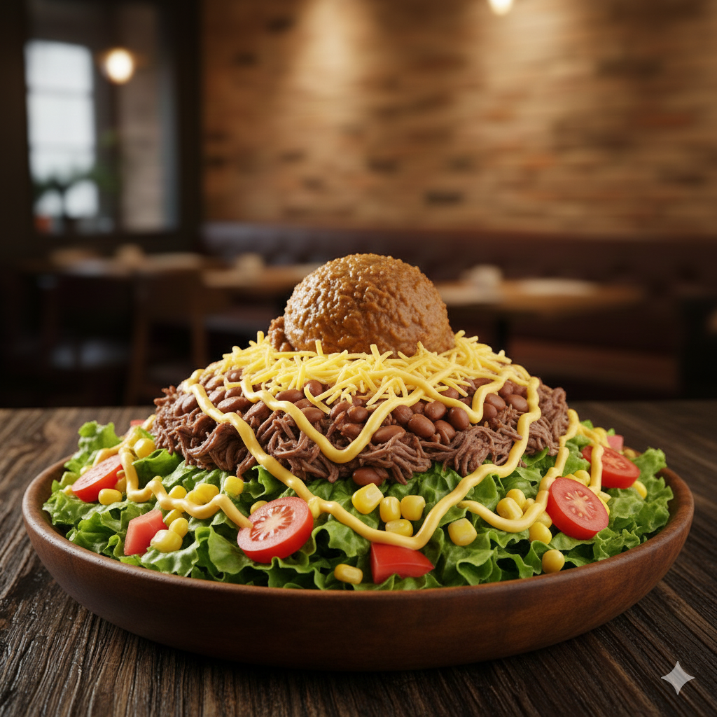 Carne desmechada, frijol refrito, queso, tomate picado, maíz, lechuga, tortillas maíz, aderezo cheddar.