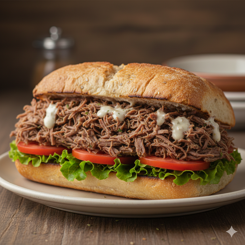 Delicioso sandwich con Carne desmechada, tomate, lechuga y salsa de la casa