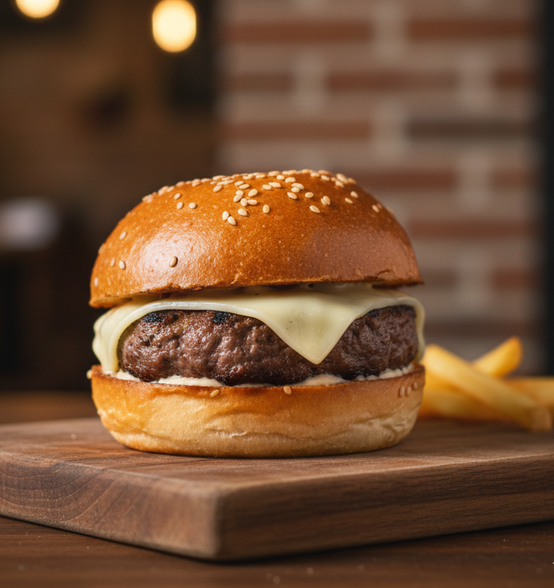 150 gramos de carne angus, tocineta, queso americano, pepinillos, cebolla, tomate.