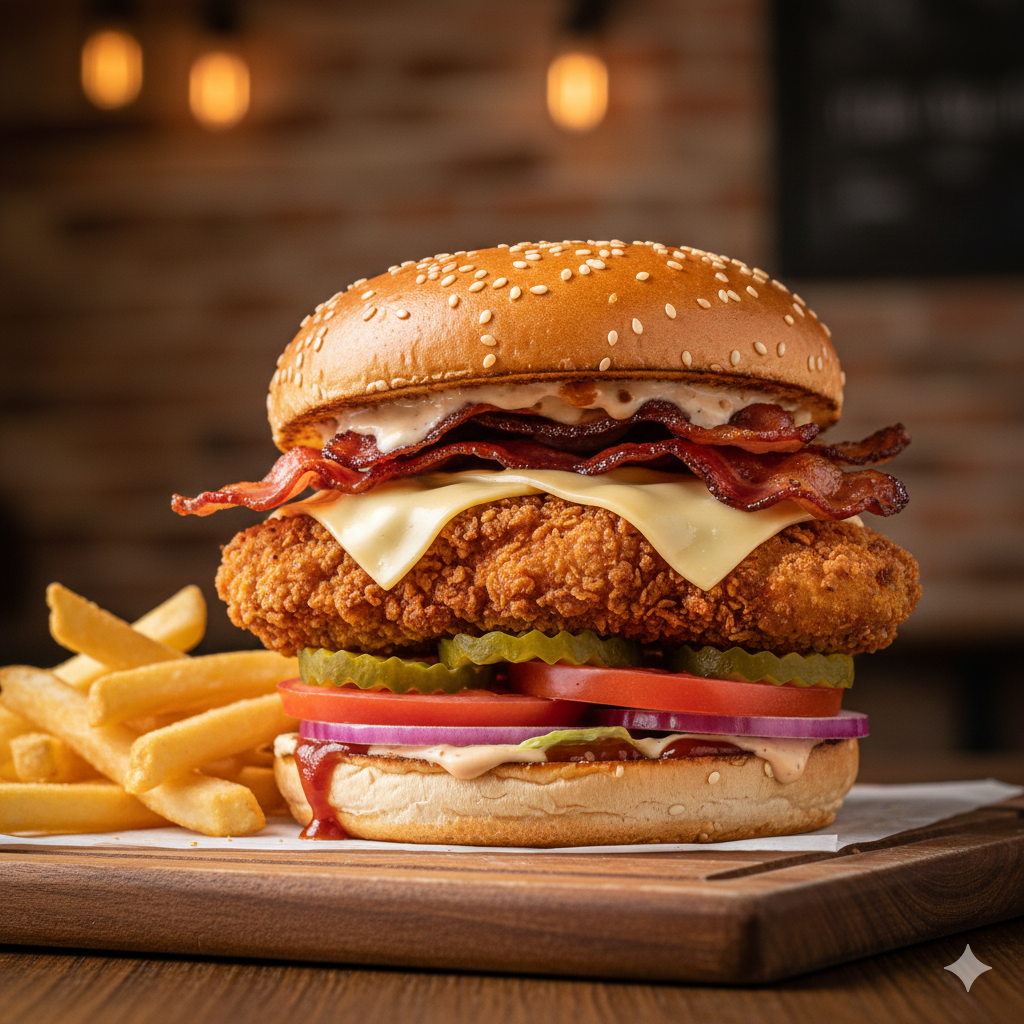 Hamburguesa pollo apanada, tocineta, doble queso, pepinillos, tomate y cebolla.