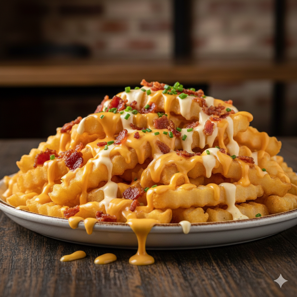 Papas bañadas en queso americano, aderezo cheddar y tocineta.