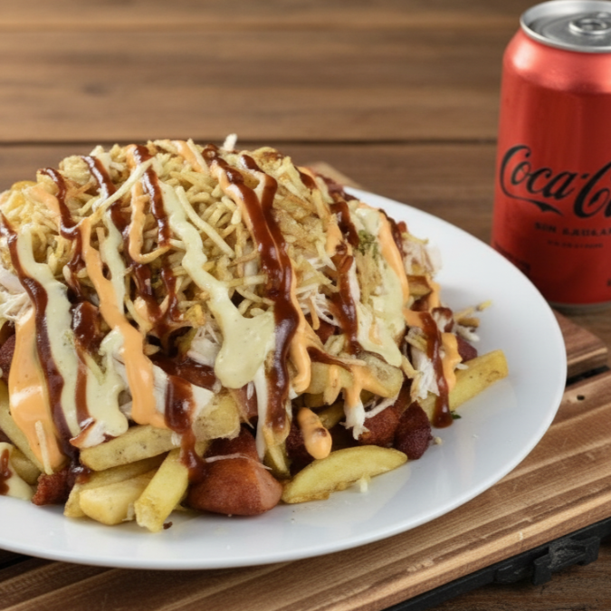 Costillitas, salchicha, pollo desmechado, papa francesa, huevos de codorniz, triple queso, ripio, salsas.