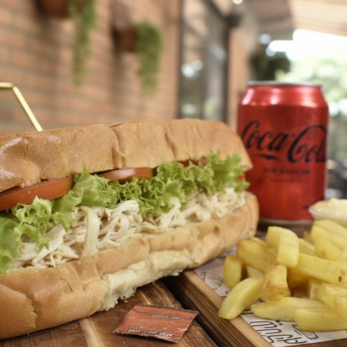 Delicioso sandwich con Pollo desmechado, tomate, lechuga y salsa de la casa acompañado de porcion de papas a la francesa y gaseosa a eleccion