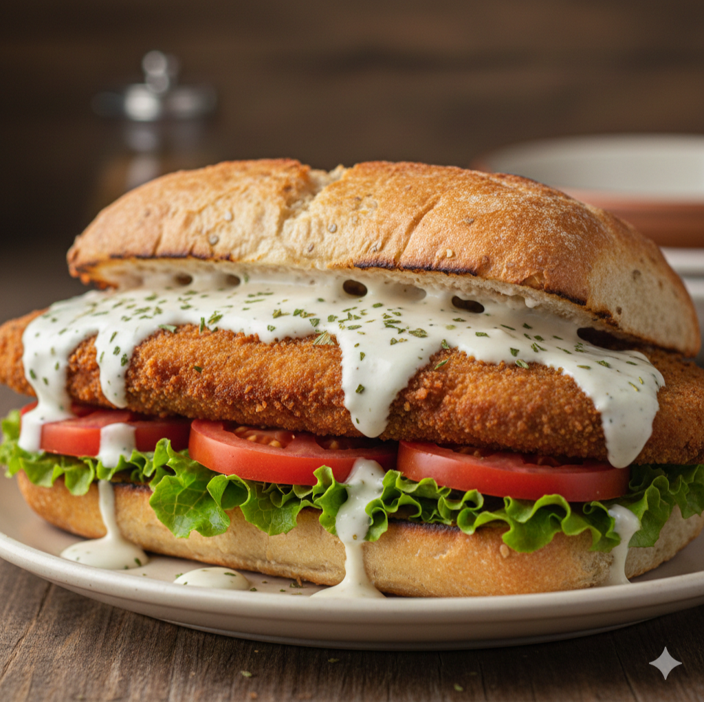 Delicioso sandwich con Milanesa de Pollo, tomate, lechuga y salsa de la casa
