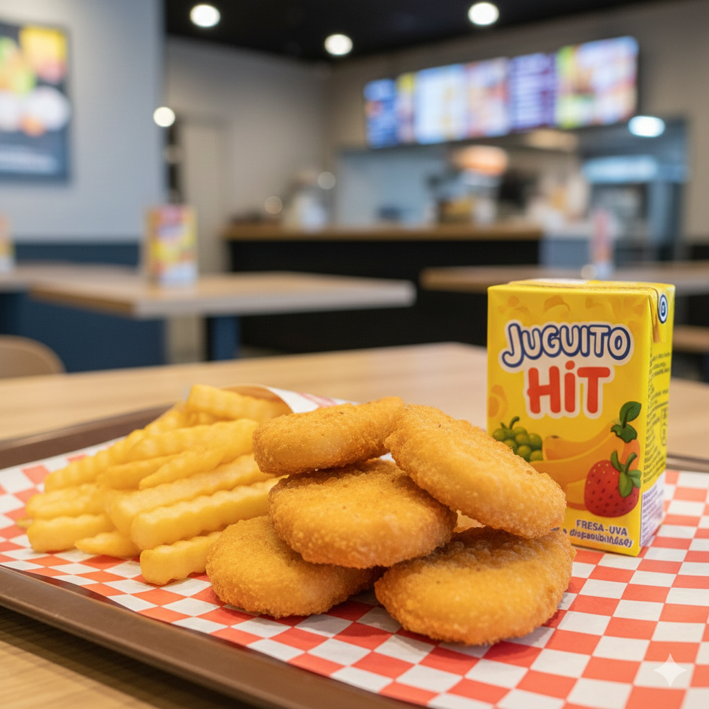5 nuggets de pollo apanados acompañado de papas a la francesa y juguito hit sabor a disponibilidad