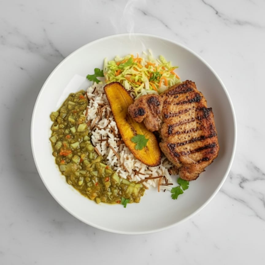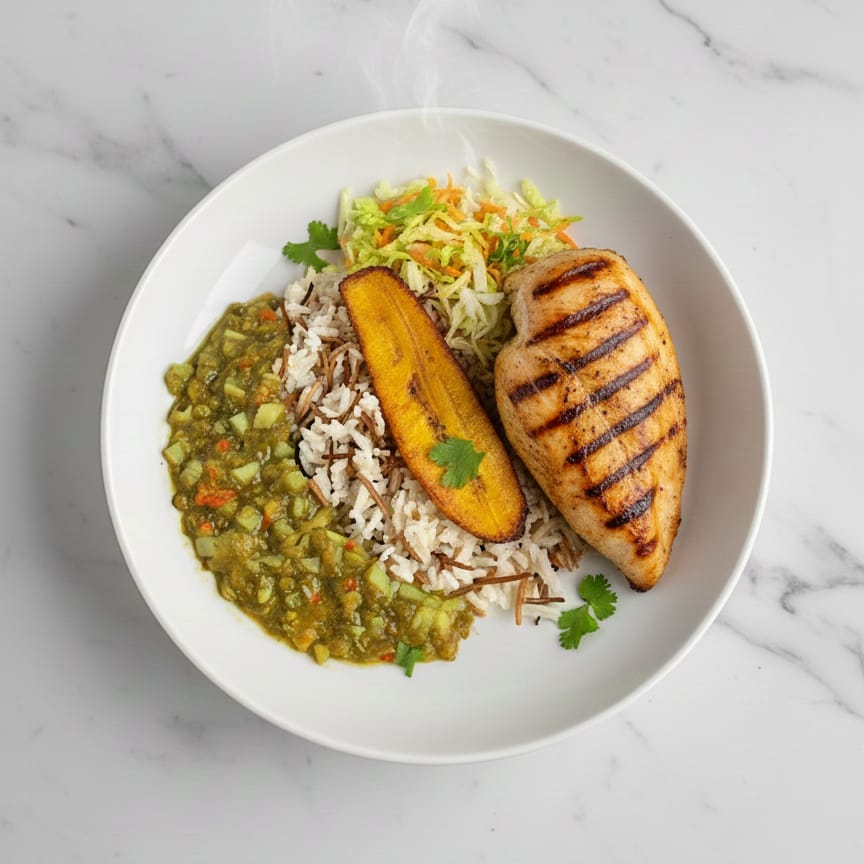 Filete de pechuga de pollo asada acompañado por sopa del día, arroz, ensalada y principio