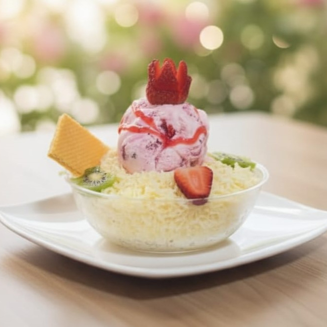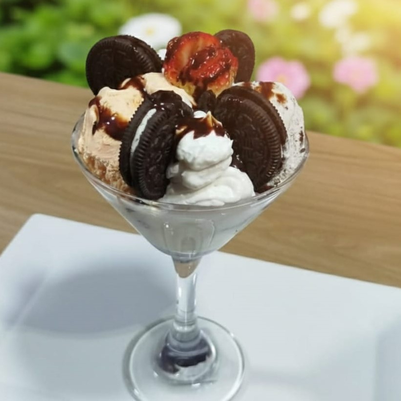 2 Bolas de helado a elección, crema de la casa, chantilly, fresas, salsa de chocolate, barquillo.