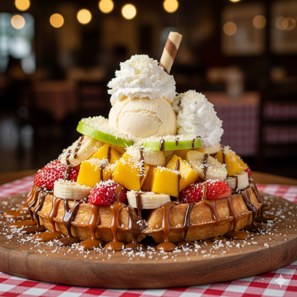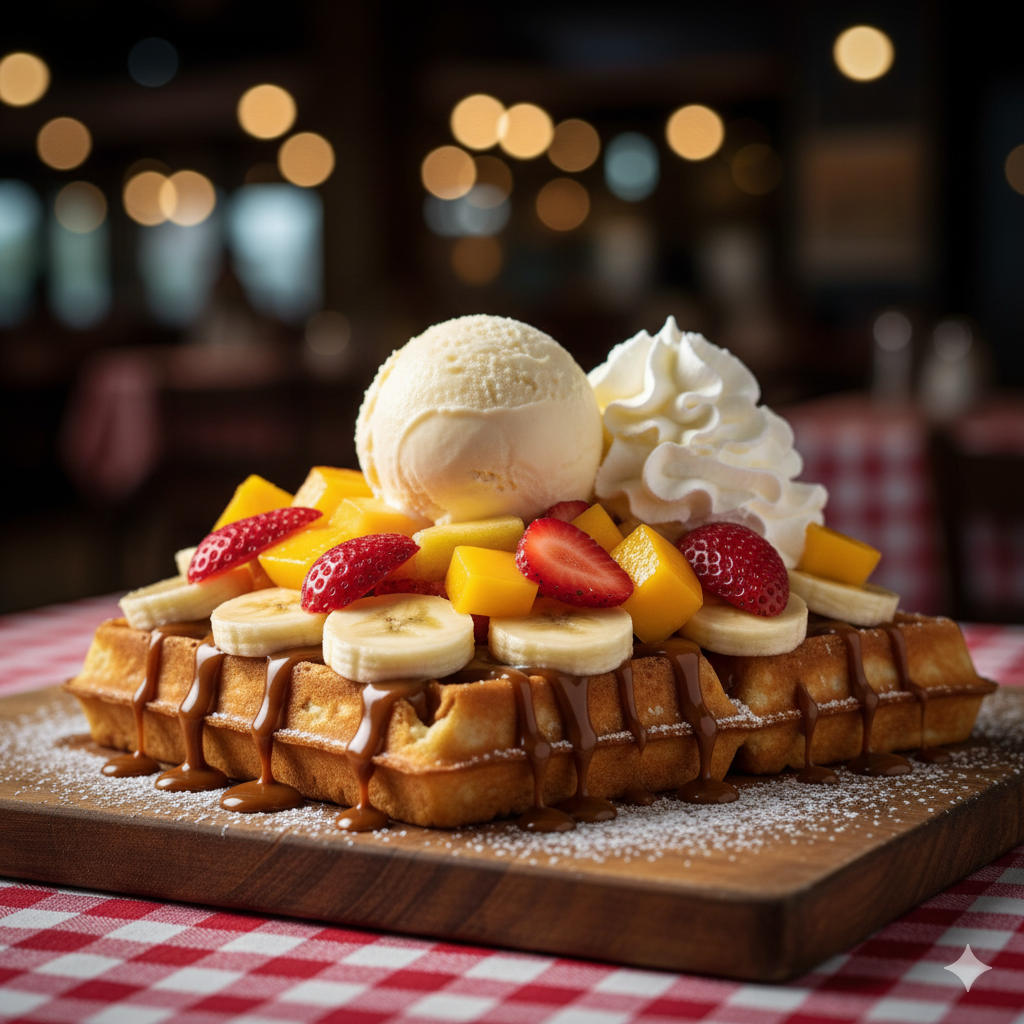 Waffle con arequipe, fresa, mango, banano, manzana, queso, 1 bola de helado, chantilly, salsa de chocolate.