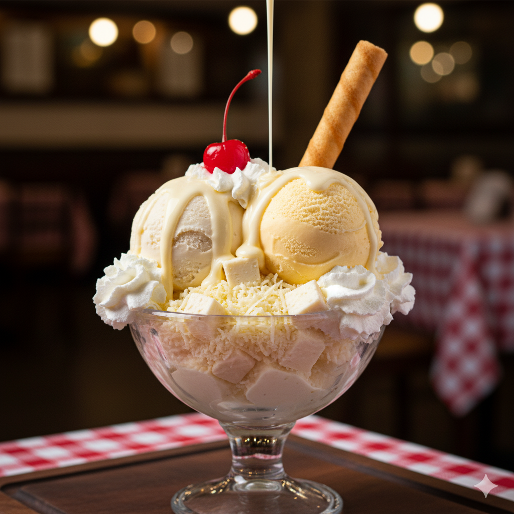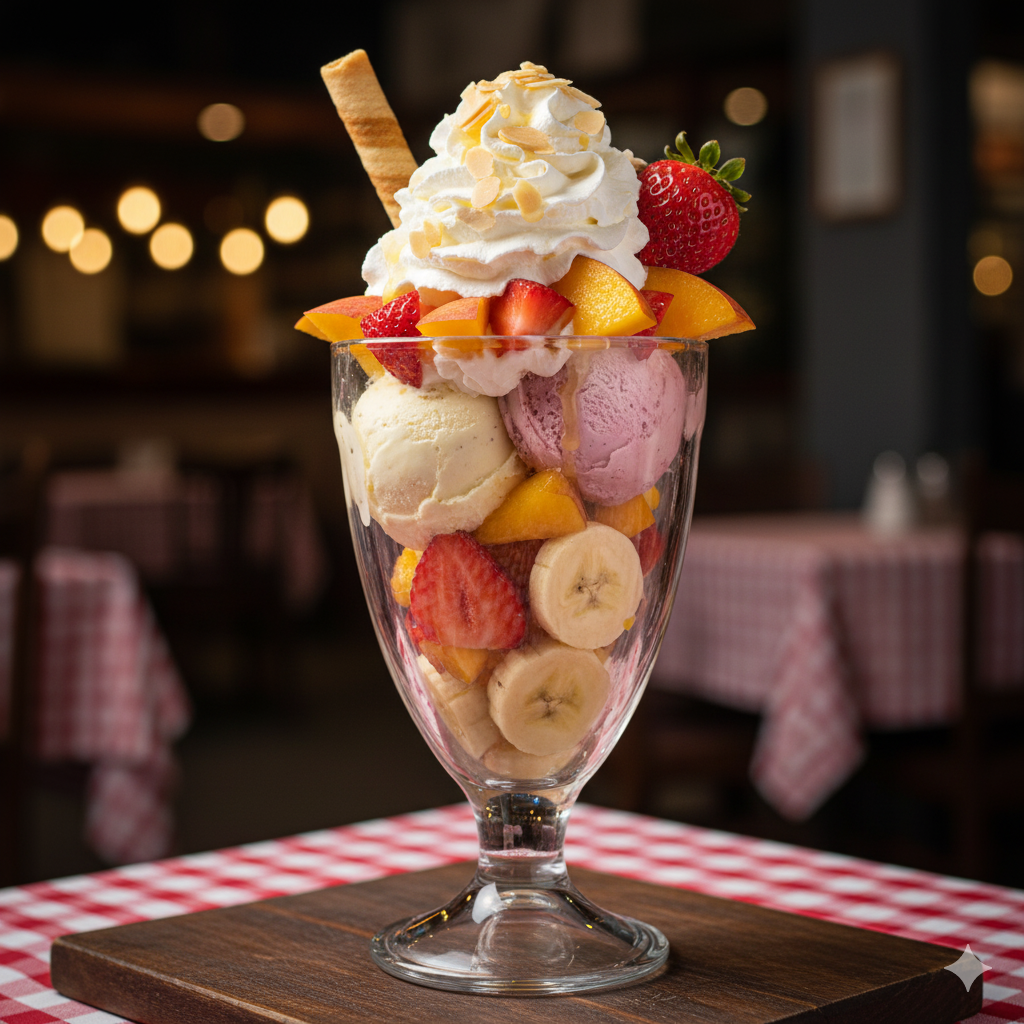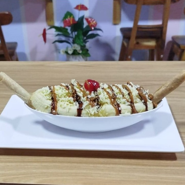 3 Bolas de helado a elección, banano, barquillo, salsa de chocolate, arequipe, chantilly, crema de leche de la casa.
